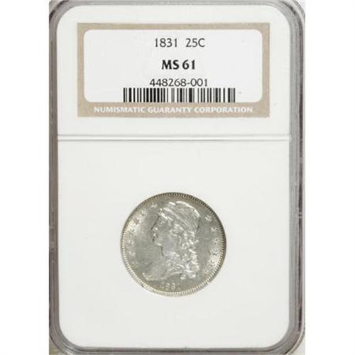 <B>1831 25C Small Letters MS61 NGC.</B></I> B-1, R.3. Well struck save for the first star, and lightly toned despite a hint of peripheral gold toning. Luster dominates the borders, eagle, and hair. Abrasions are moderate for the grade.<BR><BR><B>Coin Engraver:</B> William Kneass<BR><BR><b>Shipping:</b> Coins & Currency (<a target="_blank" href="http://www.heritageauctions.com/common/shipping.php">view shipping information</a>)