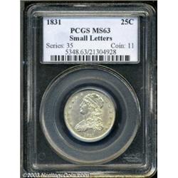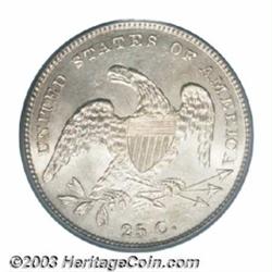 <TABLE cellSpacing=0 cellPadding=0 width="100%" bgColor=#000000 border=0><TBODY><TR><TD width="100%"><TABLE cellSpacing=1 cellPadding=3 width="100%" border=0><TBODY><TR><TD width="100%" bgColor=#79735c><FONT face=arial color=#ffffff size=3><B>Description</B> </FONT></TD></TR><TR><TD width="100%" bgColor=#ffffff><FONT face=arial size=2><B>1831 25C Small Letters MS63 PCGS.</B></I> B-2, R.1. Star eight is recut, and a series of spindly die cracks connect the peripheral legends and arrowheads on the reverse. Blushes of faint honey-gold patina invigorate the lustrous and carefully preserved surfaces. The fields have a few wispy slide marks, but the eye appeal is strong due to an absence of bagmarks. Well struck aside from the final star. While the popularity of modern issues is currently unquestioned, classic early type such as the present coin is certain to retain market favor in the years to come. </FONT></TD></TR></TBODY></TABLE></TD></TR></TBODY></TABLE><BR><A name=PricesRealized></A><TABLE cellSpacing=0 cellPadding=0 width="100%" bgColor=#000000 border=0><TBODY><TR><TD width="100%"><TABLE cellSpacing=1 cellPadding=3 width="100%" border=0><TBODY><TR><TD width="100%" bgColor=#79735c><A name=PR><FONT face=arial color=#ffffff size=3><B>Previous Prices from Heritage Auctions</B> </FONT></A></TD></TR><TR><TD bgColor=#f6f6ed><TABLE cellSpacing=0 cellPadding=0 width="100%" border=1><TBODY><TR><TD align=middle width="33%"><B>Date</B></TD><TD align=middle width="33%"><B>Service</B></TD><TD align=middle width="33%"><B>Price</B></TD></TR><TR bgColor=whitesmoke><TD width="33%"><B>10/01/1993</B></TD><TD width="33%">PCGS</TD><TD width="33%">$1,897.50</TD></TR><TR bgColor=whitesmoke><TD width="33%"><B>01/01/1996</B></TD><TD width="33%">PCGS</TD><TD width="33%">$1,265.00</TD></TR><TR bgColor=whitesmoke><TD width="33%"><B>08/07/1998</B></TD><TD width="33%">NGC</TD><TD width="33%">$3,335.00</TD></TR></TBODY></TABLE></TD></TR><TR><TD bgColor=#ffffff><FONT face=arial size=1 ?>PLEASE NOTE: All prices realized reflect the final hammer price PLUS the buyer's premium in auctions that charge a buyer's premium. Each item has a notation at the top of the listing indicating whether that lot included a buyer's premium. Example: A item that sells with a final hammer price of $100 and a 20% buyer's premium will display with a price realized of $120. All information listed is intended to be as accurate as possible, but errors are possible. Please use this guide carefully and inform us of any inaccuracies. </FONT></TD></TR></TBODY></TABLE></TD></TR></TBODY></TABLE><BR><TABLE cellSpacing=0 cellPadding=0 width="100%" bgColor=#000000 border=0><TBODY><TR><TD width="100%"><TABLE cellSpacing=1 cellPadding=3 width="100%" border=0><TBODY><TR><TD width="100%" bgColor=#79735c colSpan=6><FONT face=arial color=#ffffff size=3><B>Price Guide*</B> </FONT></TD></TR><TR bgColor=#f6f6ed><TD align=middle><B>Grade</B> </TD><TD align=middle><B>Coin World<BR>(Trends)</B> </TD><TD align=middle><B>Numismedia<BR>Retail</B> </TD><TD align=middle><B>Numismedia<BR>Wholesale</B> </TD><TD align=middle><B>Coin<BR>Universe</B> </TD><TD align=middle><B>Heritage<BR>Value Index</B> </TD></TR><TR bgColor=#ffffff><TD align=middle>62</TD><TD align=right>$1,100.00</TD><TD align=right>---</TD><TD align=right>$975.00</TD><TD align=right>$1,175.00</TD><TD align=right>$963.33</TD></TR><TR style="FONT-WEIGHT: bold" bgColor=#cccfdd><TD align=middle>63</TD><TD align=right>$2,150.00</TD><TD align=right>---</TD><TD align=right>$1,950.00</TD><TD align=right>$2,600.00</TD><TD align=right>$1,765.00</TD></TR><TR bgColor=#ffffff><TD align=middle>64</TD><TD align=right>$4,150.00</TD><TD align=right>---</TD><TD align=right>$4,175.00</TD><TD align=right>$6,000.00</TD><TD align=right>$3,726.50</TD></TR><TR bgColor=#ffffff><TD colSpan=6><FONT size=1>*All information listed is intended to be as accurate as possible, but errors are possible. No item may be returned or refused based on this information which is provided as a service to our customers. You should contact each pricing source directly to determine the accuracy of this information. </FONT></TD></TR></TBODY></TABLE></TD></TR></TBODY></TABLE><BR><TABLE cellSpacing=0 cellPadding=0 width="100%" bgColor=#000000 border=0><TBODY><TR><TD width="100%"><TABLE cellSpacing=1 cellPadding=3 width="100%" border=0><TBODY><TR><TD width="100%" bgColor=#79735c><FONT face=arial color=#ffffff size=3><B>Population Guide</B> </FONT></TD></TR><TR bgColor=#ffffff><TD align=middle><!-- Begin Output of Population Grid--><TABLE cellSpacing=0 cellPadding=0 width="100%" border=0><TBODY><TR><TD vAlign=center><TABLE cellSpacing=0 width="100%" border=1 cellsadding="3"><TBODY><TR><TD vAlign=center><TABLE cellSpacing=0 cellPadding=3 width="100%" border=1><TBODY><TR><TD vAlign=center align=middle bgColor=#f0f1e8 colSpan=2 <CENTER><FONT face=Arial size=2><B>PCGS Pop </B></FONT><CENTER></CENTER></TD><TD vAlign=center align=middle bgColor=#f0f1e8 colSpan=2><CENTER><FONT face=Arial size=2><B>NGC Pop</B></CENTER></FONT></TD></TR><TR><TD vAlign=center><FONT face=Arial size=2>(63)</FONT> </TD><TD vAlign=center align=right><FONT face=Arial size=2>27</FONT> </TD><TD vAlign=center><FONT face=Arial size=2>(63)</FONT> </TD><TD vAlign=center align=right><FONT face=Arial size=2>39</FONT> </TD></TR><TR><TD vAlign=center><FONT face=Arial size=2>(>63)</FONT> </TD><TD vAlign=center align=right><FONT face=Arial size=2>51</FONT> </TD><TD vAlign=center><FONT face=Arial size=2>(>63)</FONT> </TD><TD vAlign=center align=right><FONT face=Arial size=2>75</FONT> </TD></TR></TBODY></TABLE></TD></TR></TBODY></TABLE></TD></TR></TBODY></TABLE><!-- End Output of Population Grid--> Important notice: Heritage usually auctions material at the rate of 200-250 lots per hour. On some occasions eBay Live bid software or the Internet may not be able to keep up with the pace of the auction. We recommend placing a realistic absentee bid now as insurance to avoid disappointment. Occasionally the 