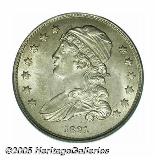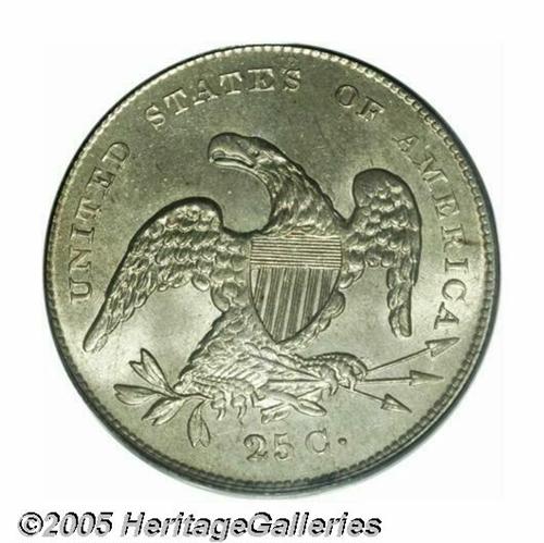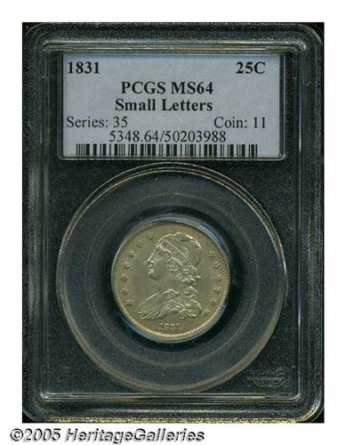 <B>1831<25C> Small Letters MS64 PCGS.</B></I> B-4, R.1. Die State IV. This variety is most easily attributed by double punching on the 5 in the denomination, and the final star positioned close to the hair curl. This die state is rare as such and is characterized by the patch of die rust by the final S in STATES. This essentially untoned example is generally well struck with a smooth obverse and sparingly abraded reverse. Population: 45 in 64, 16 finer (4/05).