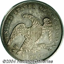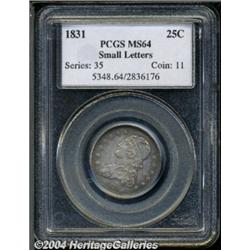 <B>1831<25C> Small Letters MS64 PCGS.</B></I> B-4, R.1. A slender die crack through the C in the denomination aids the identification of this exquisitely struck near-Gem. Golden-brown, lilac, and electric-blue patina embraces the attractively preserved semi-prooflike surfaces. A scarce type in Mint State, produced in much smaller quantities than the Bust Half Dollars of the era. The bottom of the holder has a small crack that has no effect on the preservation of the coin itself. Population: 42 in 64, 17 finer (3/04). <BR><BR><B>Important notice:</B> Heritage usually auctions material at the rate of 200-250 lots per hour. On some occasions eBay Live bid software or the Internet may not be able to keep up with the pace of the auction. We recommend placing a realistic absentee bid now as insurance to avoid disappointment. Occasionally the auctioneer may eliminate or reject an eBay Live bid, and the auctioneer may also reopen a lot after the close of the eBay live bidding (usually because we missed an audience bid), and may reject your bid even if it shows you as the winning bidder. By bidding via eBay Live, you agree that Heritage may award the lot to another bidder at its sole discretion under the circumstances described above or any other reasonable circumstances. Since eBay bids are not shown to us until we open the lot on the floor, we treat those bids just like floor bids. In most cases the floor responds before the eBay bid is presented to us, due to Internet lag time, so for consistency we have made it a policy that floor bids are always considered first over tie eBay live bids. Also please note that all Heritage lots purchased through eBay Live carry a 20% Buyer's Premium. Please make sure you read the Terms and Conditions before you bid. </span></font></tr></table></td></tr></table>