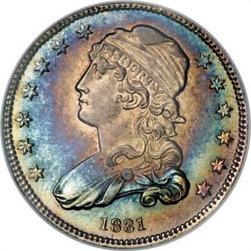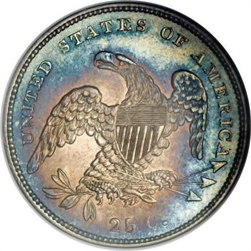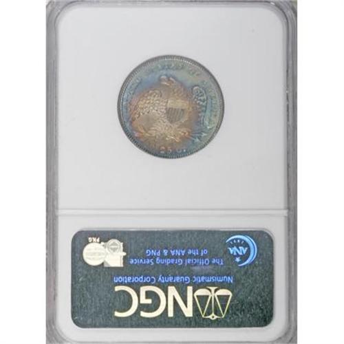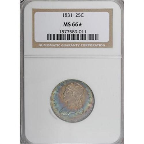 <B>1831 25C Small Letters MS66 <img src="/images/star.gif" width="10" height="10" alt="" border="0"> NGC.</B></I> B-2, R.2. The Breen quarter book best sums up the significance of 1831 quarters:<BR> <BR> "A marked change appears in the quarter dollar of this year, the diameter is considerably reduced with a consequent increase in thickness. The change of type, however, is only affected by the size of the devices, which are reduced to conform to the size of the coin, and the omission from the reverse of the scroll bearing the motto, E PLURIBUS UNUM."<BR><BR>The B-2 variety is one of the more frequently encountered of the six varieties of the year. Yet, it is curiously absent from our auction records in the better grades of Uncirculated. This is, in fact, the finest example of this variety we are aware of and, dare we say? the finest known. This piece is an advanced die state and shows all the cracks mentioned in Breen, including: " ... reverse in later pieces is cracked in two place; at left, connecting tops of letters in UNITED and STATES; at right, connecting top of C and A in AMERICA and the three arrowheads." <BR> The surfaces are absolutely stunning. Smooth, silky mint luster shines brightly over each side and gives added glow to the rose-gray centers and cobalt-blue peripheral color. Sharply defined on each side. As one would expect for an MS66 <B><img src="/images/star.gif" width="10" height="10" alt="" border="0"></B></I>, the surfaces are exceptionally clean and problem-free. One of the finest 1831 quarters regardless of variety, and possibly the finest known of this variety.<BR><I>From The Madison Collection.</B></I><BR><BR><B>Coin Engraver:</B> William Kneass<BR><BR><b>Shipping:</b> Coins & Currency (<a target="_blank" href="http://www.heritageauctions.com/common/shipping.php">view shipping information</a>)