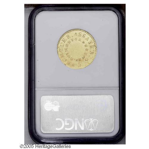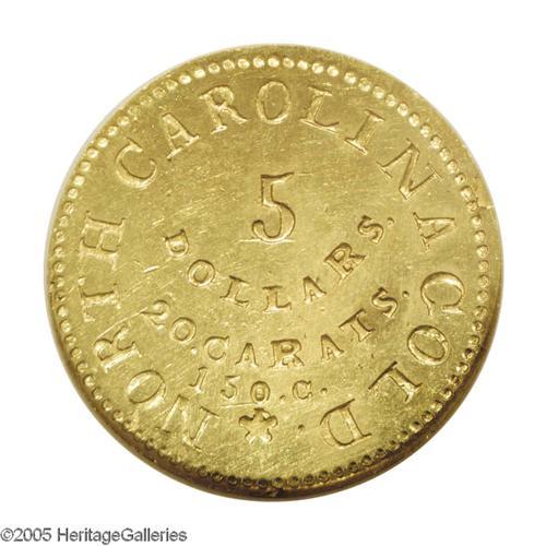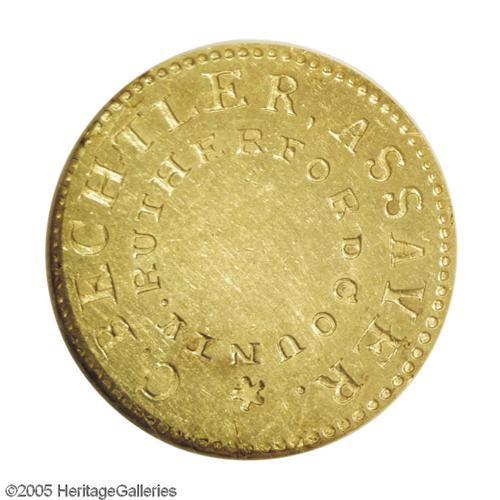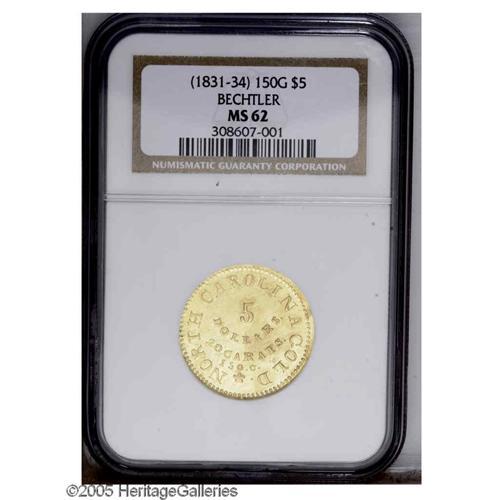<B>(1831-34)<$5> C.Bechtler Five Dollar, 150G. 20.CARATS MS62 NGC.</B></I> K-15, Breen-7743, R.7. A lovely, mildly reflective representative with full border beads that are only slightly askew on the obverse. Both sides show medium, natural green-gold color, with a subtle reddish blush across the center of the obverse. Surface marks are somewhat numerous, but generally light and scuffy and fail to diminish the coin's prooflike qualities. Several tiny planchet cracks are noticed at the borders.<BR> Struck by Christopher Bechtler in the autumn of 1831, this variety is held in high esteem by collectors of Southern gold as the first half eagle produced by the Rutherford County, North Carolina coiner. Most of these initial strikings were soon melted as two weight reductions occurred within a span of three years. It has long been regarded as a rarity and it is estimated that a mere 15 to 20 pieces are known. Six years have passed since our last offering of a Bechtler K-15 in any grade. Only three Mint State pieces have been certified by both services combined. Census: 1 in 62, 0 finer (11/05). Listed on page 345 of the 2006 <I>Guide Book.</B></I><BR><I>From The Great Western Collection of Territorial Gold, Part Two.</B></I>