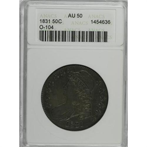 <B>1831 50C AU50 ANACS.</B></I> O-104. NGC Census: (59/918). PCGS Population (111/791). Mintage: 5,873,660. Numismedia Wsl. Price for NGC/PCGS coin in AU50: $310. (#6159)<BR><BR><B>Coin Engraver:</B> John Reich<BR><BR><b>Shipping:</b> Coins & Currency (<a target="_blank" href="http://www.heritageauctions.com/common/shipping.php">view shipping information</a>)