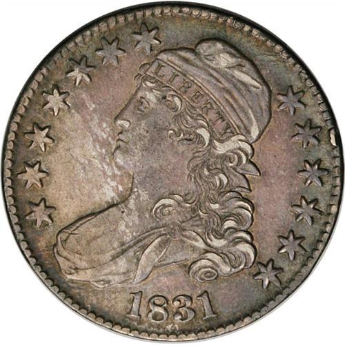 <B>1831<50C> AU50--Improperly Cleaned--NCS. AU Details.</B></I> O-107, R.3. The recut LIBERTY is plain. Die lapping has removed some, but not all, of the die lines protruding from Liberty's bust. On the reverse, the arrow shaft is interrupted under the eagle's right (facing) claw, but lapping has effaced virtually all trace of the tine of metal protruding upward from the top olive leaf, also characteristic of the O-107 (and O-120) reverse. After conservation this coin has disturbed luster and a flat appearance, with irregular toning in which sunset-orange and deep blue predominate. No mentionable distractions show under a glass. Envelope Included.