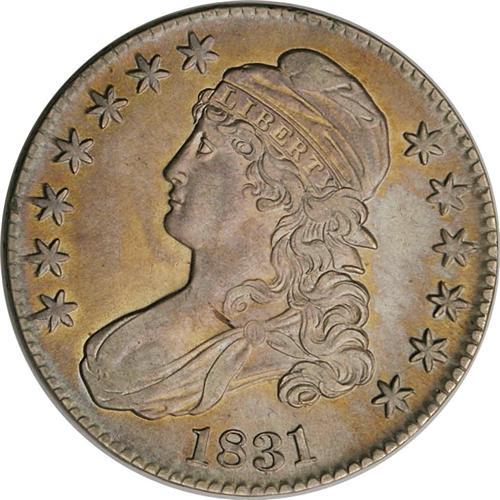 <B>1831<50C> AU50--Improperly Cleaned--NCS. AU Details.</B></I> O-112, R.3. This scarce variety has long, slender 1's with full serifs in the date. The lowest arrow feather extends well left (facing) of the 5 in 50 C. After conservation this coin has disturbed luster, yet it retains considerable eye appeal. Light rub is confined to the cheek highpoints, the eagle's left wing, and the claws. The color is dove-gray, with copper highlights throughout. The strike is weak at the bustline and IBUS in the motto, but decent overall. Examination with a glass shows a dark toning streak near the forecurl and a small nick behind Liberty's eye. Still a desirable coin. Envelope Included.