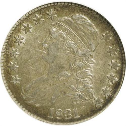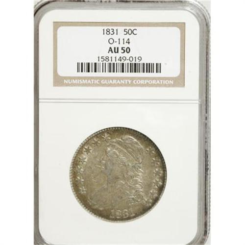 <B>1831 50C AU50 NGC.</B></I> O-114. NGC Census: (56/880). PCGS Population (111/767). Mintage: 5,873,660. Numismedia Wsl. Price for NGC/PCGS coin in AU50: $221. (#6159)<BR><BR><B>Coin Engraver:</B> John Reich<BR><BR><b>Shipping:</b> Coins & Currency (<a target="_blank" href="http://www.heritageauctions.com/common/shipping.php">view shipping information</a>)