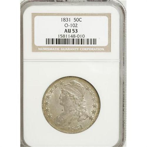 <B>1831 50C AU53 NGC.</B></I> O-102. NGC Census: (68/812). PCGS Population (74/693). Mintage: 5,873,660. Numismedia Wsl. Price for NGC/PCGS coin in AU53: $275. (#6159)<BR><BR><B>Coin Engraver:</B> John Reich<BR><BR><b>Shipping:</b> Coins & Currency (<a target="_blank" href="http://www.heritageauctions.com/common/shipping.php">view shipping information</a>)