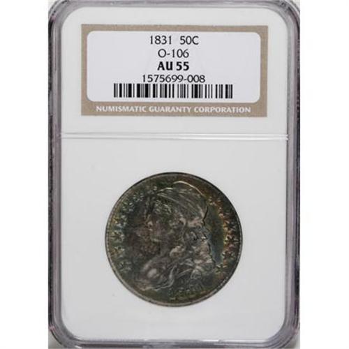 <B>1831 50C AU55 NGC.</B></I> O-106. NGC Census: (135/673). PCGS Population (139/545). Mintage: 5,873,660. Numismedia Wsl. Price for NGC/PCGS coin in AU55: $300. (#6159)<BR><BR><B>Coin Engraver:</B> John Reich<BR><BR><b>Shipping:</b> Coins & Currency (<a target="_blank" href="http://www.heritageauctions.com/common/shipping.php">view shipping information</a>)