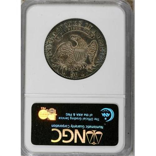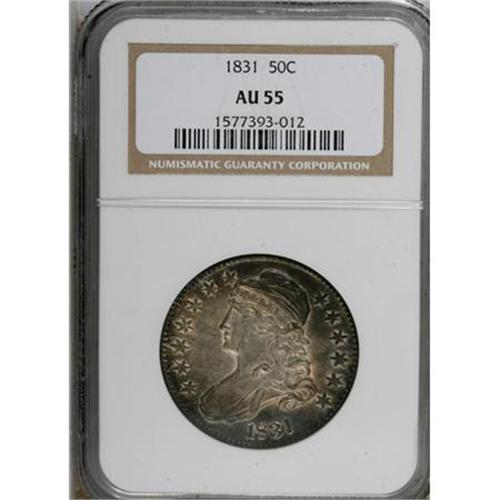 <B>1831 50C AU55 NGC.</B></I> O-108, R.1. Cobalt-blue, emerald-green, golden-brown, and cream-gray endow this satiny and lightly abraded Choice AU Bust half. Protected areas display traces of powdery olive-gray debris.<BR><BR><B>Coin Engraver:</B> John Reich<BR><BR><b>Shipping:</b> Coins & Currency (<a target="_blank" href="http://www.heritageauctions.com/common/shipping.php">view shipping information</a>)