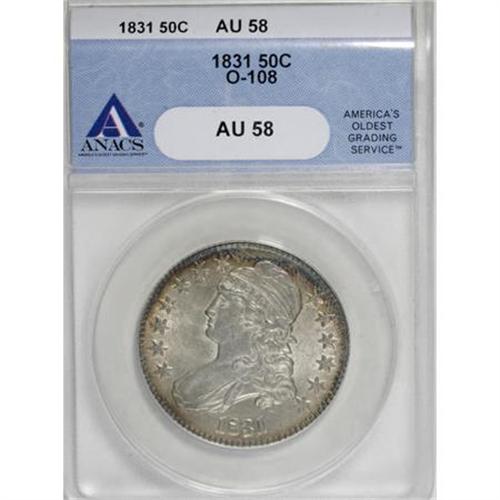 <B>1831 50C AU58 ANACS.</B></I> O-108. NGC Census: (291/419). PCGS Population (161/406). Mintage: 5,873,660. Numismedia Wsl. Price for NGC/PCGS coin in AU58: $585. (#6159)<BR><BR><B>Coin Engraver:</B> John Reich<BR><BR><b>Shipping:</b> Coins & Currency (<a target="_blank" href="http://www.heritageauctions.com/common/shipping.php">view shipping information</a>)