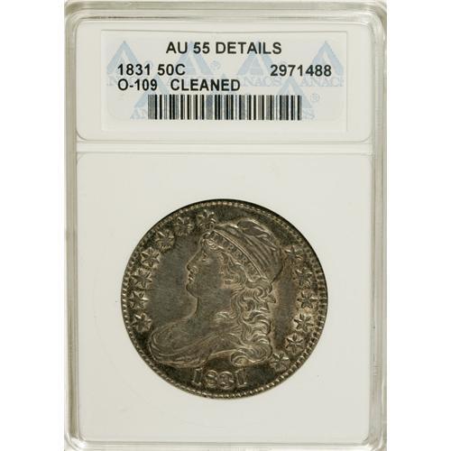 <B>1831 50C --Cleaned--ANACS. AU55 Details.</B></I> O-109. NGC Census: (268/1330). PCGS Population (131/530). Mintage: 5,873,660. Numismedia Wsl. Price for NGC/PCGS coin in AU55: $300. (#6159)<BR><BR><b>Shipping:</b> Coins & Currency (<a target="_blank" href="http://www.heritageauctions.com/common/shipping.php">view shipping information</a>)