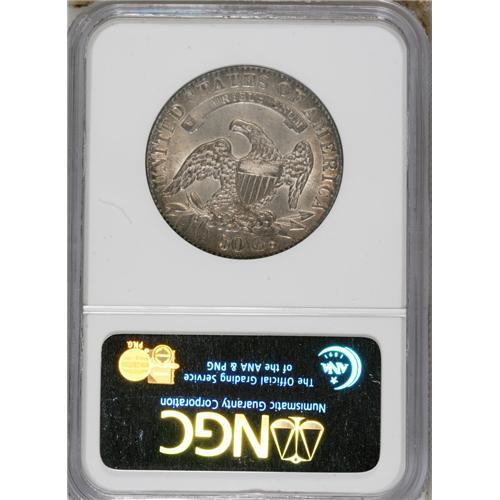 <B>1831 50C MS61 NGC.</B></I> O-109, R.2. The 8 in the date is higher than the 3 at both top and bottom, and a small die lump appears in the left obverse field near the inner point of star 5. Lines 2 and 3 of stripe 1 are joined, with a slight separation visible at the top. Lustrous surfaces display wisps of red-tan patination around the peripheries, and most of the design elements are well impressed. Light adjustment marks are noted at the left obverse border.<BR><BR><b>Shipping:</b> Coins & Currency (<a target="_blank" href="http://www.heritageauctions.com/common/shipping.php">view shipping information</a>)