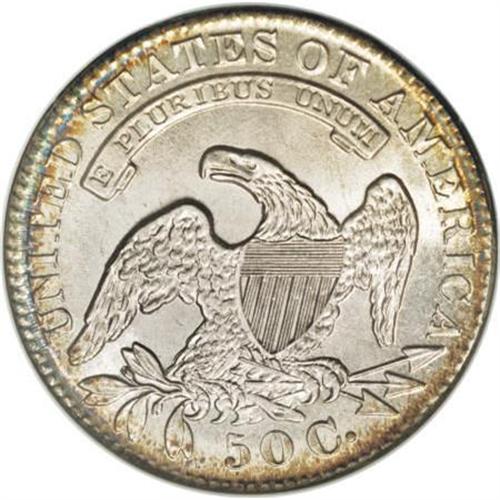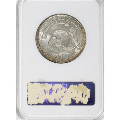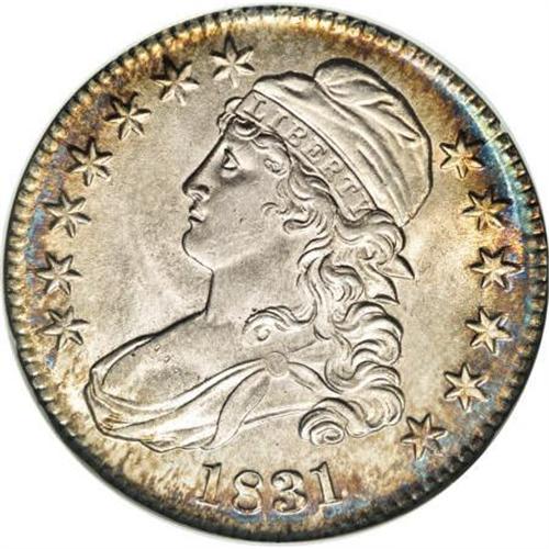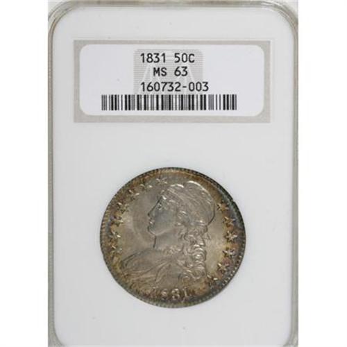 <B>1831 50C MS63 NGC.</B></I> O-103, R.1. Attributed by the recut stand of the 5 in the denomination. A beautiful silver type coin with medium golden-brown toning. The borders possess glimpses of powder-blue and aquamarine. Lustrous, sharply struck, and unblemished. Housed in a prior generation holder.<BR><BR><B>Coin Engraver:</B> John Reich<BR><BR><b>Shipping:</b> Coins & Currency (<a target="_blank" href="http://www.heritageauctions.com/common/shipping.php">view shipping information</a>)