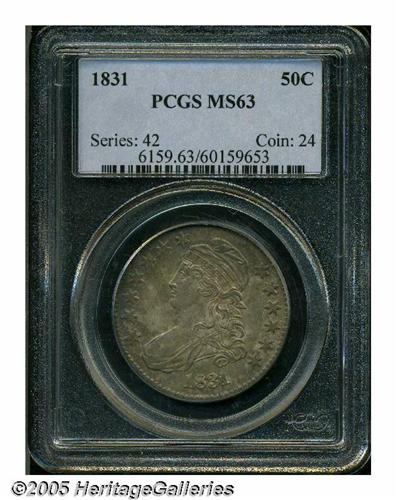 <B>1831<50C> MS63 PCGS.</B></I> O-111, R.1. Dusky golden-brown and plum colors envelop this undisturbed Capped Bust Half. The major devices are well struck, although the stars and the LUR in PLURIBUS are typically impressed.