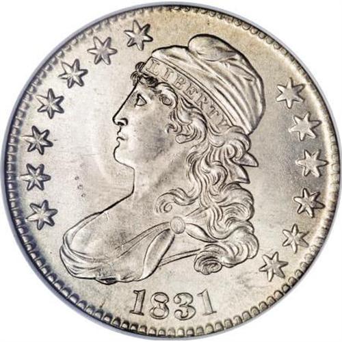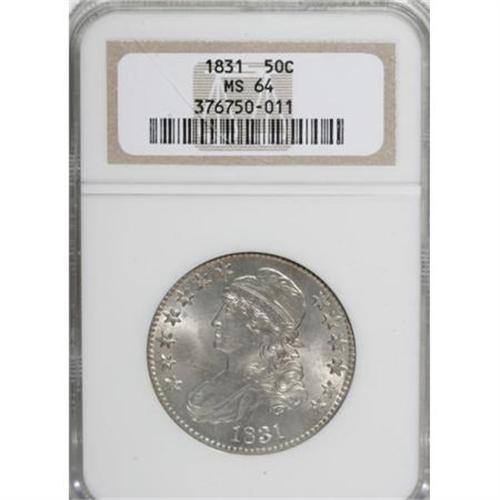 <B>1831 50C MS64 NGC.</B></I> O-116, R.3. The stars are large and close to the milling, with the key stars distant from the central design. The left side of the shield has a broad double border, and the right bottom serif of the M is recut. This brilliant silver coin, with just a slight golden tinge, has beautiful cartwheel luster over the surfaces. Under a loupe some light, parallel roller marks appear on the lower obverse and on the central shield, obviously mint-produced and completely undistracting. A lovely, original near-Gem coin.<BR><I>From The Southwest Collection.</B></I><BR><BR><B>Coin Engraver:</B> John Reich<BR><BR><b>Shipping:</b> Coins & Currency (<a target="_blank" href="http://www.heritageauctions.com/common/shipping.php">view shipping information</a>)