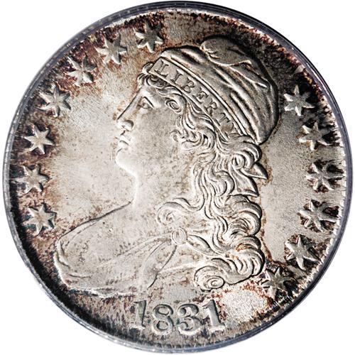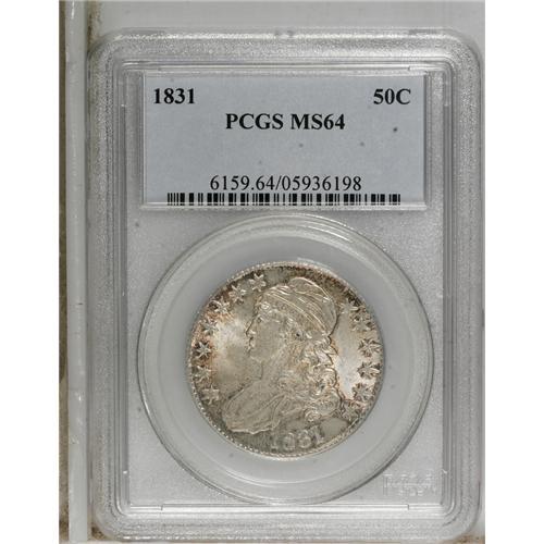 <B>1831 50C MS64 PCGS.</B></I> O-106, R.3. Die lapping has removed all traces of the die lines found on some O-106s and all O-107s, that protrude from the front of Liberty's bust. This variety shares the O-107 obverse and the O-105 reverse. LIBERTY is recut at the left edge of each letter. Sharply defined in the centers, the peripheral stars are weak, as usual on this variety. Mostly brilliant with just a bit of russet toning surrounding the devices on each side. A lustrous near-Gem.<BR><BR><b>Shipping:</b> Coins & Currency (<a target="_blank" href="http://www.heritageauctions.com/common/shipping.php">view shipping information</a>)