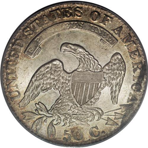 <B>1831 50C MS64 PCGS.</B></I> O-110, R.2. This is an attractive, original coin, with olive-gold color evident above a steel-gray sheen and a few darker areas in the peripheries. Luster is complete and attractive, and surface marks appear to be sparse for the Choice grade. Areas of striking weakness on the reverse, most notably on LURI, are common to this variety. Housed in a green label PCGS holder.<BR><BR><b>Shipping:</b> Coin/Currency (<a target="_blank" href="http://www.heritageauctions.com/common/shipping.php">view shipping information</a>)