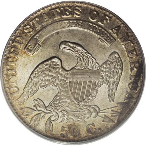 <B>1831 50C MS64 PCGS.</B></I> O-110, R.2. This is an attractive, original coin, with olive-gold color evident above a steel-gray sheen, and a few darker areas in the peripheries. Luster is complete and attractive, and surface marks appear to be sparse for the Choice grade. Areas of striking weakness on the reverse, most notably on LURI, are common to this variety. Housed in a green label PCGS holder.<BR><BR><b>Shipping:</b> Coins & Currency (<a target="_blank" href="http://www.heritageauctions.com/common/shipping.php">view shipping information</a>)