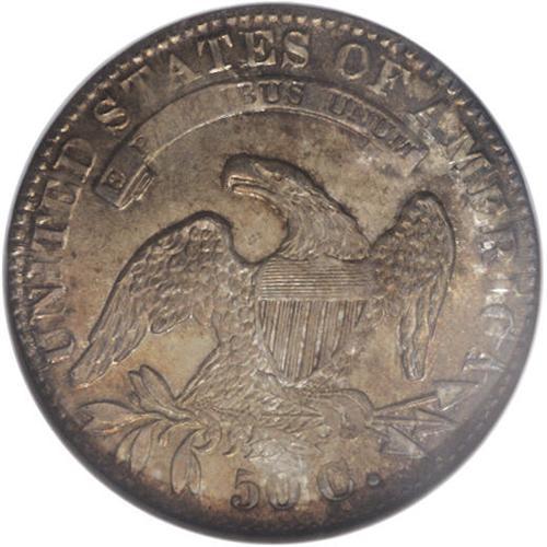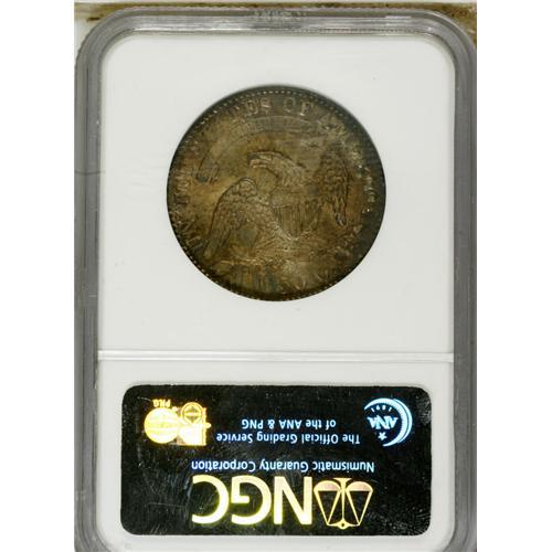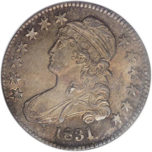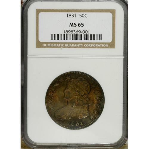 <B>1831 50C MS65 NGC.</B></I> O-109, R.1. Deep orange and jade-green toning drapes this satiny and unabraded Gem. A wonderful example for the collector who craves originality. The stars and the LUR in PLURIBUS are soft, but the major devices are well struck save for the right (facing) claw. Census: 53 in 65, 16 finer (1/07).<BR><BR><b>Shipping:</b> Coins & Currency (<a target="_blank" href="http://www.heritageauctions.com/common/shipping.php">view shipping information</a>)