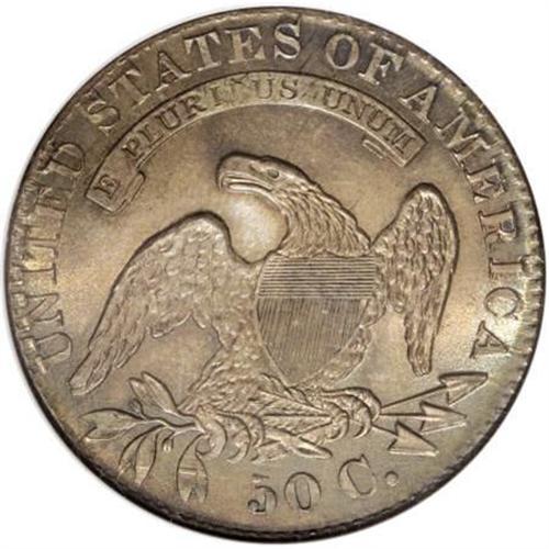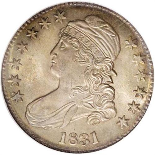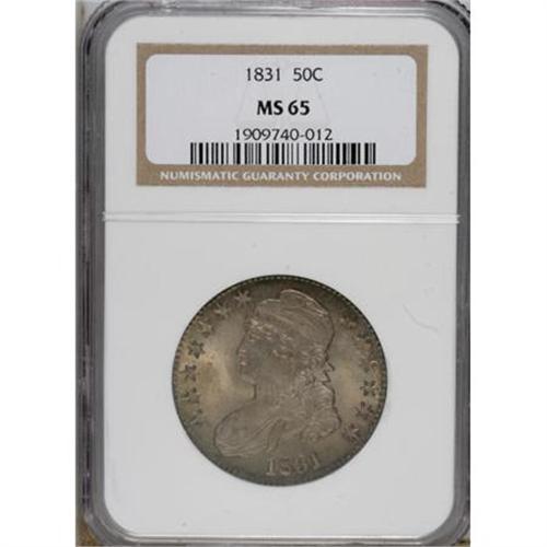 <B>1831 50C MS65 NGC.</B></I> O-112, R.3. Blended apple-green and orange-red enrich this lustrous Gem. The fields are unabraded, and only a faint vertical line above the jaw precludes a finer grade. The major devices are sharply struck, although a couple of stars and the TE in STATES lack complete definition.<BR><BR><b>Shipping:</b> Coins & Currency (<a target="_blank" href="http://www.heritageauctions.com/common/shipping.php">view shipping information</a>)