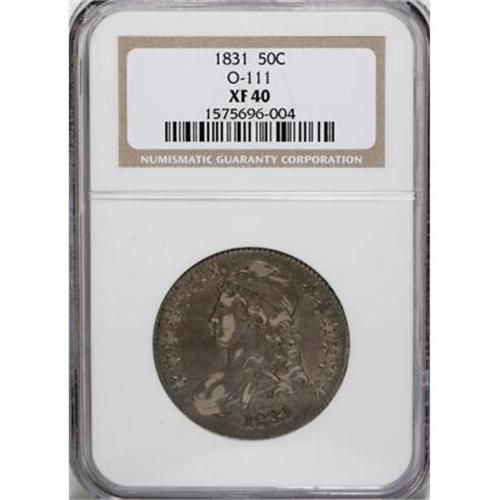 <B>1831 50C XF40 NGC.</B></I> O-111. NGC Census: (28/1006). PCGS Population (37/930). Mintage: 5,873,660. Numismedia Wsl. Price for NGC/PCGS coin in XF40: $71. (#6159)<BR><BR><B>Coin Engraver:</B> John Reich<BR><BR><b>Shipping:</b> Coins & Currency (<a target="_blank" href="http://www.heritageauctions.com/common/shipping.php">view shipping information</a>)