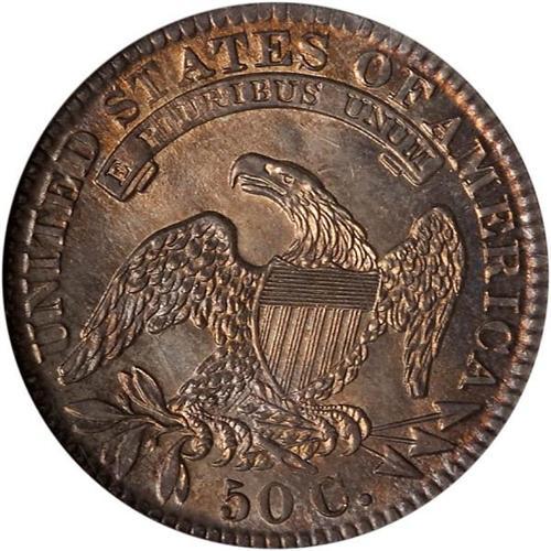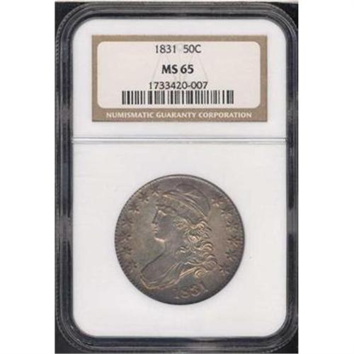 <b>1831 Capped Bust Half Dollar. NGC graded MS65.</b> Original toned and refreshingly clean for this issue, with shimmering gem-quality luster in the fields and light golden-gray patina. The fields are smooth with satin luster. Sheer boldness of strike throughout would be the ideal for a bust half dollar of the 1830s, but this coin failed to strike completely in one or two areas only, and was left after the rebound of the dies in a somewhat soft state at the LUR of PLURIBUS and on the stars. However, the eagle's feathers are complete and bold, the shield extensively detailed, while Liberty's hair curls are complete down to the sometimes weak "lovelock" curl on her shoulder <b>(PCGS # 6159)</b>