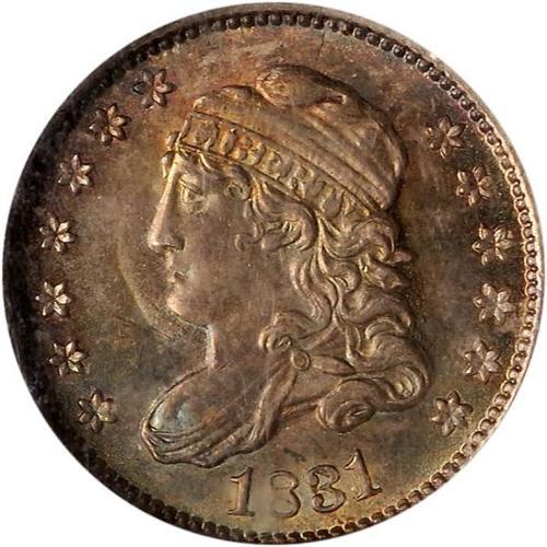 <b>1831 Capped Bust Half Dime. NGC graded MS65.</b> An worthwhile gem of this diminutive type by any standard, the luster is not in the least timid or yielding, while pale champagne gray and other toning hues blossom on both sides. The strike, like the luster, is confident, indeed, as bold as ever seen on virtually any date in the capped bust half dime series. This design was struck from 1829 to 1837, coincidentally paralleling the two terms of President Andrew Jackson (1829-37) <b>(PCGS # 4278)</b>