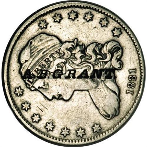 <B>1831 Bust Quarter Counterstamped.</B></I> Brunk G-456. An 1831 Bust quarter counterstamped with the name <B>A.B. Grant.</B></I> This is the earliest date known for this person on a coin. <BR> <BR><BR><b>Shipping:</b> Coins & Currency (<a target="_blank" href="http://www.heritageauctions.com/common/shipping.php">view shipping information</a>)