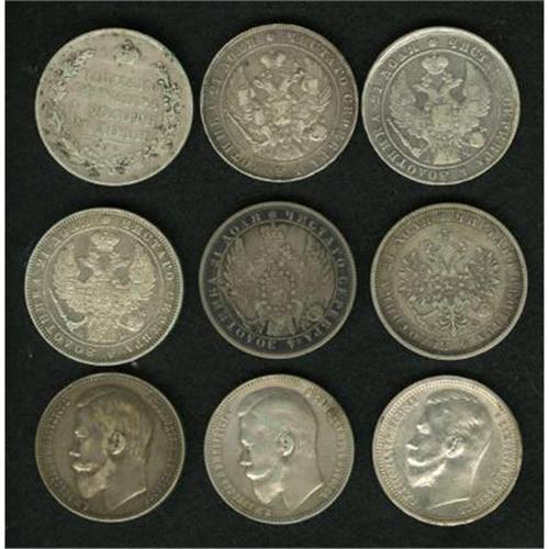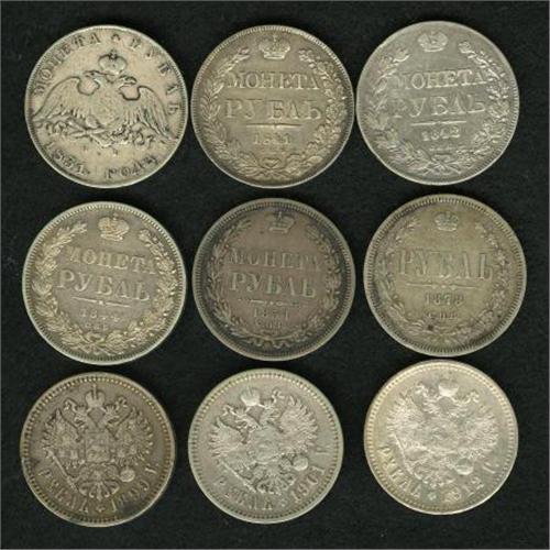 <B>Nine-piece Rouble lot including.</B></I> 1831 C??-H?, KM161, closed 2, cleaned VF with scratches on both sides; 1841 C??-H?, KM168.1, about XF; 1842 C??-A?, KM168.1, lightly cleaned VF with light reverse scratches; 1844 C??-??, KM168.1, about XF with light reverse scratches; 1854 C??-HI, KM168.1, VF-XF; 1878 C??-H?, KM25, good VF; 1899 ??, KM59.3, VF with reverse staining; 1901 ??, KM59.3, VF; and a 1912 ??, KM59.3, XF. <BR><BR><b>Shipping:</b> Coins & Currency (<a target="_blank" href="http://www.heritageauctions.com/common/shipping.php">view shipping information</a>)