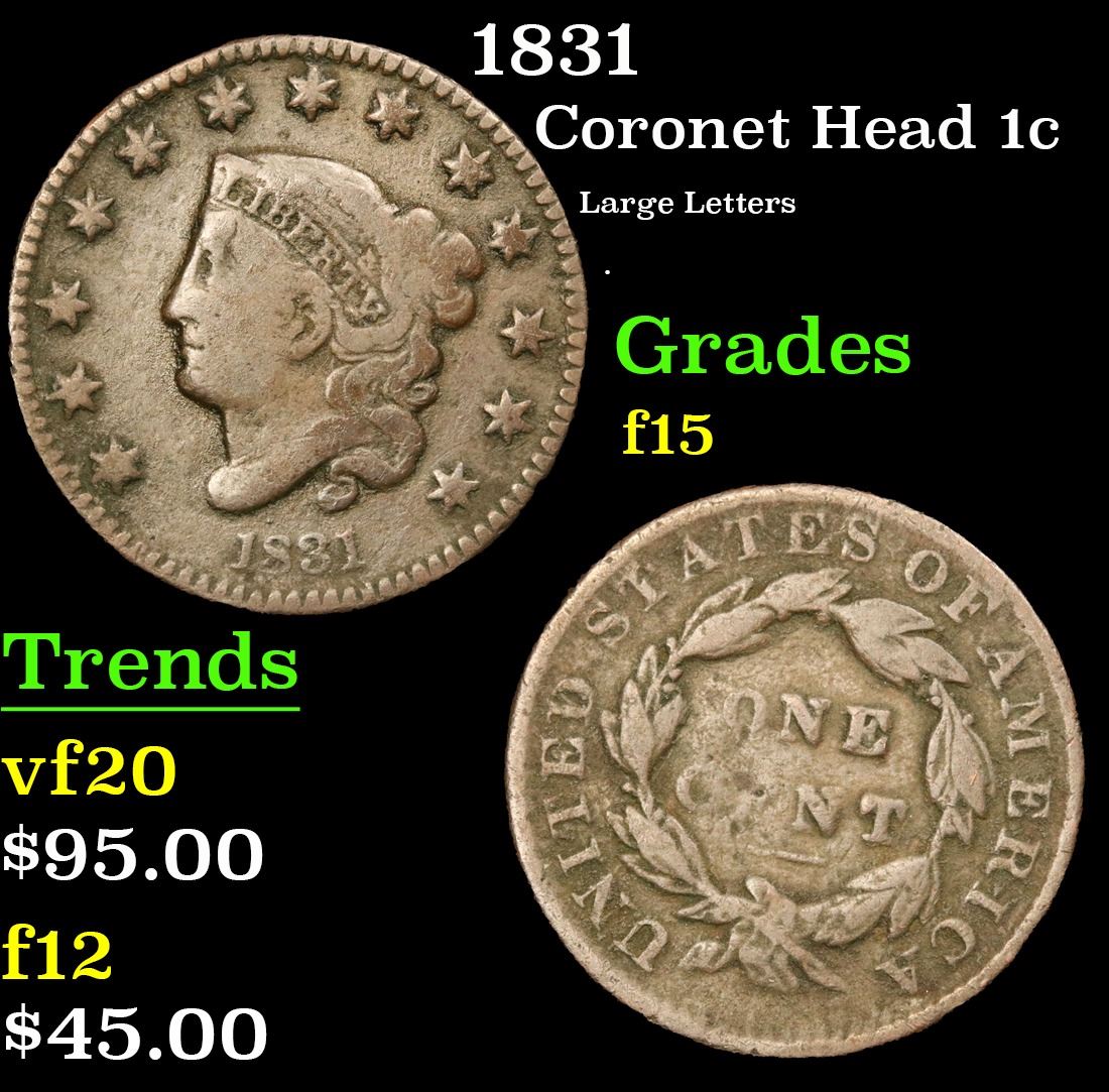 1831 Large Letters . Coronet Head Large Cent 1c Grades f+.
