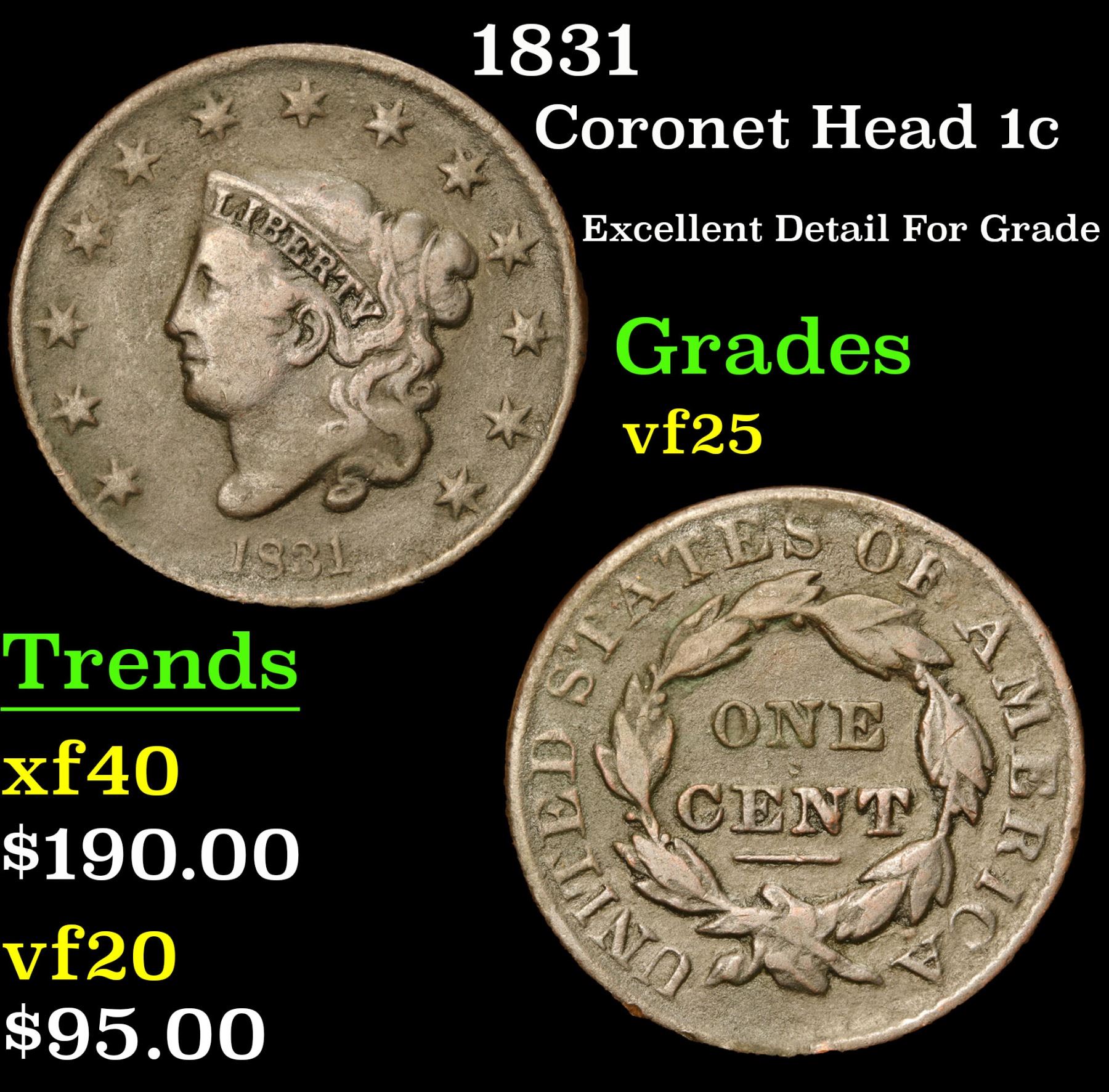 1831 Coronet Head Large Cent 1c Grades vf+. Excellent Detail For Grade A Corey's Pick, Bid to Win Coin