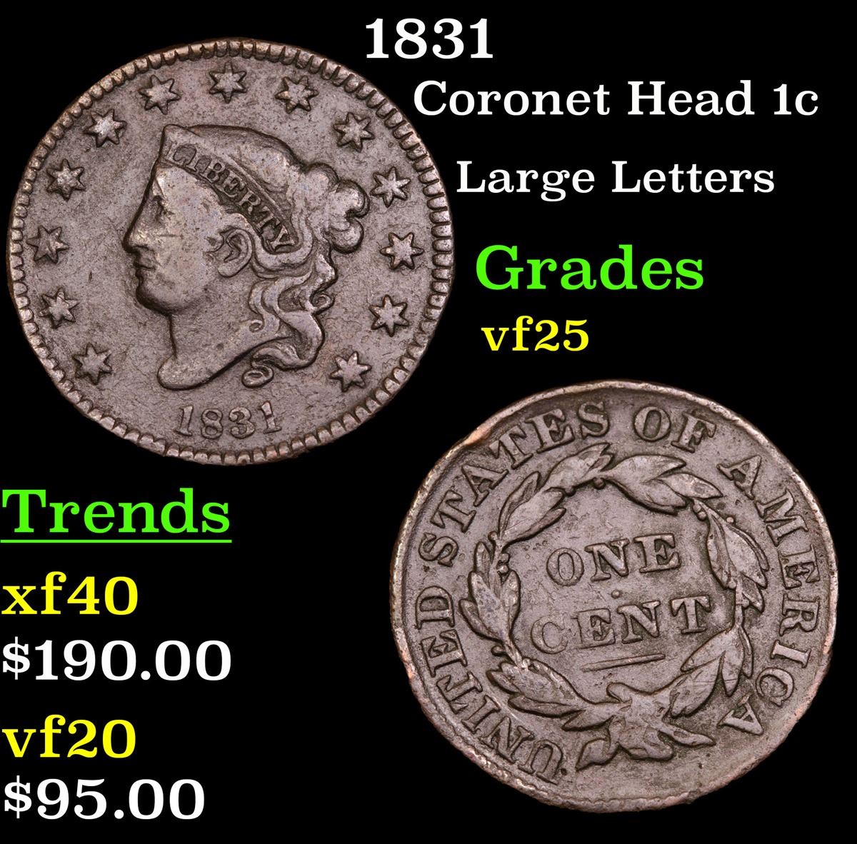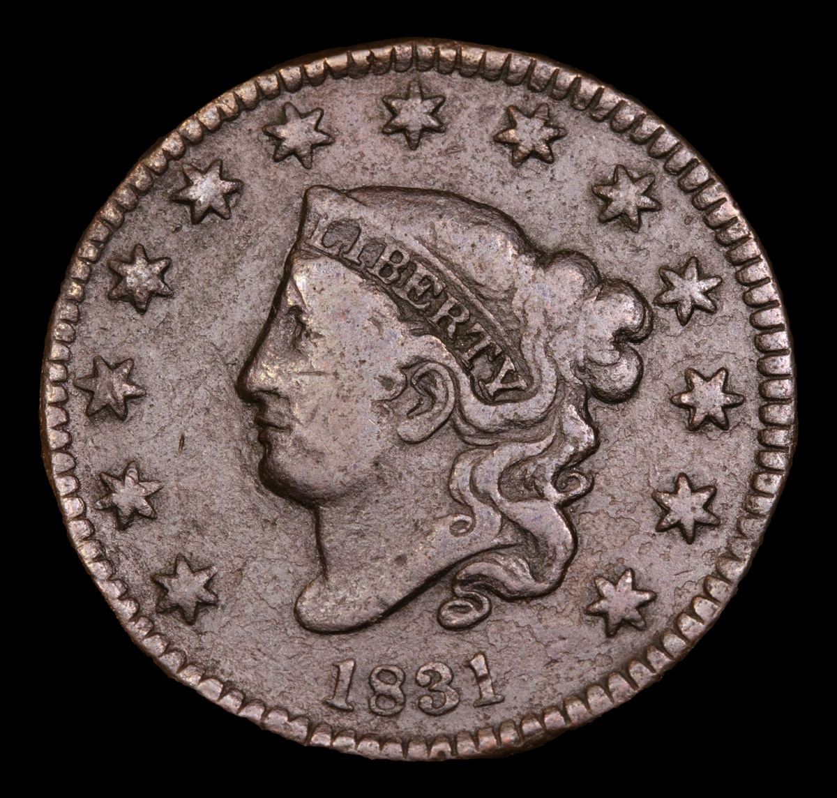 1831 Large Letters . Coronet Head Large Cent 1c Grades vf+.