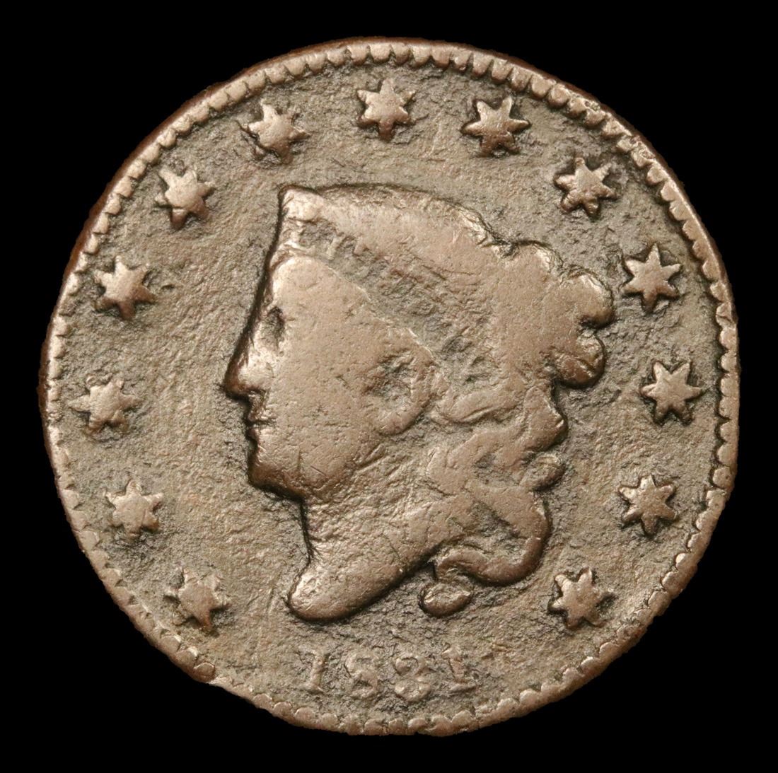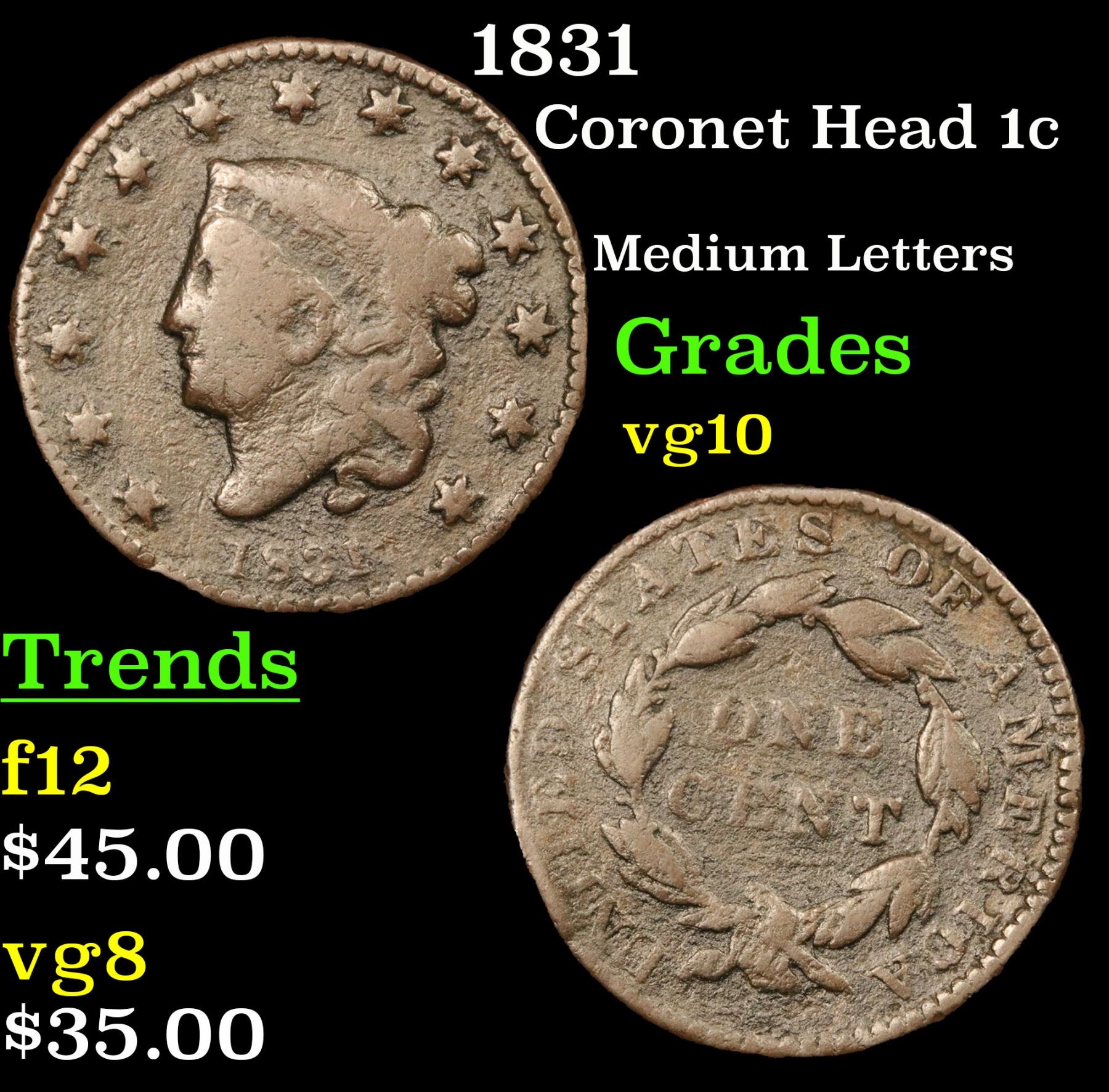 1831 Medium Letters . Coronet Head Large Cent 1c Grades vg+.