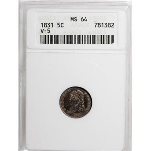 <B>1831 H10C MS64 ANACS.</B></I> V-5, LM-5, R.1. Rose, lilac, and orange patina enriches this boldly struck and unblemished near-Gem. The obverse is semi-prooflike, while the reverse is satiny. A worthy acquisition for the specialist.<BR><BR><B>Coin Engraver:</B> William Kneass<BR><BR><b>Shipping:</b> Coins & Currency (<a target="_blank" href="http://www.heritageauctions.com/common/shipping.php">view shipping information</a>)