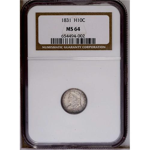 <B>1831<H10C> MS64 NGC.</B></I> V-2, LM-3, R.4. This is the scarcest die marriage of the year, and the present example is among the finest we have seen. In fact, this coin is similar in quality to the William Harmon coin that we sold some months ago, and these two are the best that we have offered. The obverse has extensive die cracks through the stars along the left border, and across the bust to stars 12 and 13. The design elements are sharply detailed, and the surfaces have satiny luster. <BR><BR><B>Important notice:</B> Heritage usually auctions material at the rate of 200-250 lots per hour. On some occasions eBay Live bid software or the Internet may not be able to keep up with the pace of the auction. We recommend placing a realistic absentee bid now as insurance to avoid disappointment. Occasionally the auctioneer may eliminate or reject an eBay Live bid, and the auctioneer may also reopen a lot after the close of the eBay live bidding (usually because we missed an audience bid), and may reject your bid even if it shows you as the winning bidder. By bidding via eBay Live, you agree that Heritage may award the lot to another bidder at its sole discretion under the circumstances described above or any other reasonable circumstances. Since eBay bids are not shown to us until we open the lot on the floor, we treat those bids just like floor bids. In most cases the floor responds before the eBay bid is presented to us, due to Internet lag time, so for consistency we have made it a policy that floor bids are always considered first over tie eBay live bids. Also please note that all Heritage lots purchased through eBay Live carry a 20% Buyer's Premium. Please make sure you read the Terms and Conditions before you bid. This lot is being auctioned in conjunction with a live floor auction by Heritage Galleries & Auctioneers. All final auction and invoice information will be supplied by Heritage Galleries & Auctioneers, and all other information should be considered preliminary. Lot:1873 <BR><BR><B>Winning Notification and Billing:</B> After the FINAL session in this auction is complete, Heritage will send e-mail and snail mail invoices. This process normally takes several days. All final auction and invoice information will be supplied by Heritage Galleries & Auctioneers, and all other information should be considered preliminary. <BR><BR>This auction will be conducted on a live auction floor and over the Internet through eBay Live. If you choose to place an absentee bid, please take a moment to <font color='#0000ff'><u><a href='http://pages.ebay.com/liveauctions/help/before/laabsentee.html'>learn how eBay Live absentee bidding works</a></u></font><font color='#000000'>