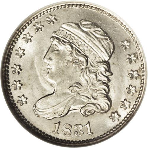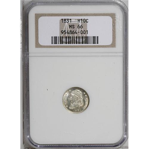 <B>1831<H10C> MS66 NGC.</B></I> V-3, LM-7, R.2. Mostly brilliant with thick mint luster, and just a slight silver-gold cast noted near the rims. The devices are well defined throughout, and there is a semiprooflike glimmer in the fields. While there are numerous Mint State examples known of this variety, this piece may well be among the finest known. Only twice before have we offered this variety in so fine a grade.