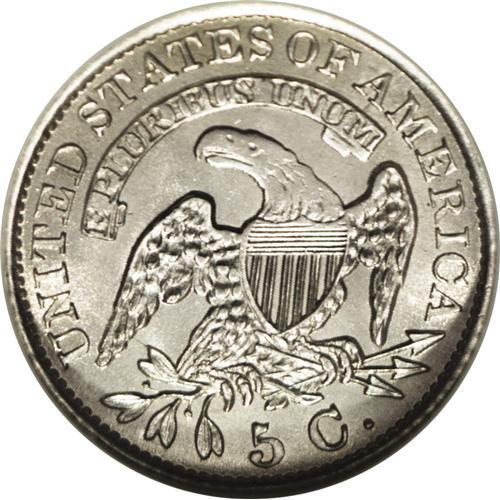 <B>1831<H10C> MS66 NGC.</B></I> V-5, LM-5, R.1. This brilliant and thoroughly lustrous Capped Bust type coin has gorgeously smooth surfaces, and is essentially unimprovable aside from striking softness on the eagle's neck and on Liberty's curls near her drapery clasp. LM-5 is promptly identified by a lengthy die line from the uppermost olive leaf. Census: 30 in 66, 10 finer (5/06).