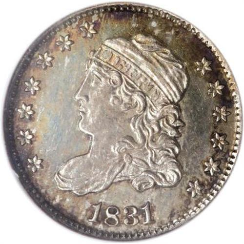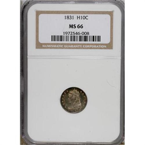 <B>1831 H10C MS66 NGC.</B></I> V-4, LM-4, R.2. Russet-gold and lime-green toning adorns this penetratingly struck Premium Gem. The fields are moderately prooflike, although the piece is undesignated as such by NGC. The obverse field is particularly flashy. Even prolonged inspection beneath a loupe fails to locate abrasions. Outstanding quality for the date, type, or variety collector.<BR><BR><b>Shipping:</b> Coins & Currency (<a target="_blank" href="http://www.heritageauctions.com/common/shipping.php">view shipping information</a>)