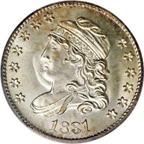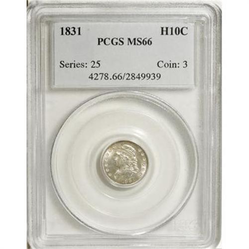 <B>1831 H10C MS66 PCGS.</B></I> V-3, LM-7, R.2. The 1s in the date are centered over denticles, and the branch stem is distant from the upper serif of the C. Whispers of olive-green visit the highly lustrous surfaces on the obverse of this Premium Gem example. An attentive strike sharpens the design elements, and there are no significant marks to report. Population: 36 in 66, 8 finer (8/07).<BR><I>From The Mario Eller Collection, Part One.</B></I><BR><BR><B>Coin Engraver:</B> William Kneass<BR><BR><b>Shipping:</b> Coins & Currency (<a target="_blank" href="http://www.heritageauctions.com/common/shipping.php">view shipping information</a>)
