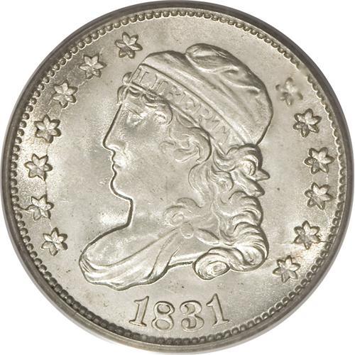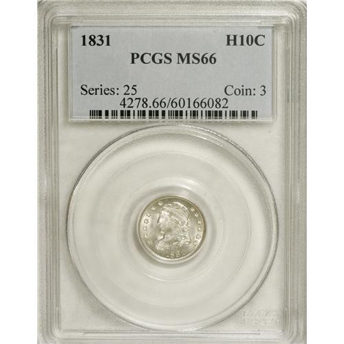 <B>1831 H10C MS66 PCGS.</B></I> V-2, LM-3, R.4. Star 7 points to the upper part of the headband, and the right edge of the second 1 in the date is centered over a dentil on the obverse, while the UN of UNITED touch at the top, and the tip of the arrow feather is right of center of the flag of 5 on the reverse. Logan and McCloskey (1998) write that this is the third and final use of Obverse 1, which shows a series of die cracks at most of the stars, and from the curl through stars 12 and 13 to the rim. Lustrous, mostly brilliant surfaces exhibit just a wisp or two of light tan-red color, and are nicely preserved. A well executed strike has imparted good definition on the design elements. Population: 36 in 66, 0 finer (3/07).<BR><I>From The Palakika Collection.</B></I><BR><BR><b>Shipping:</b> Coins & Currency (<a target="_blank" href="http://www.heritageauctions.com/common/shipping.php">view shipping information</a>)