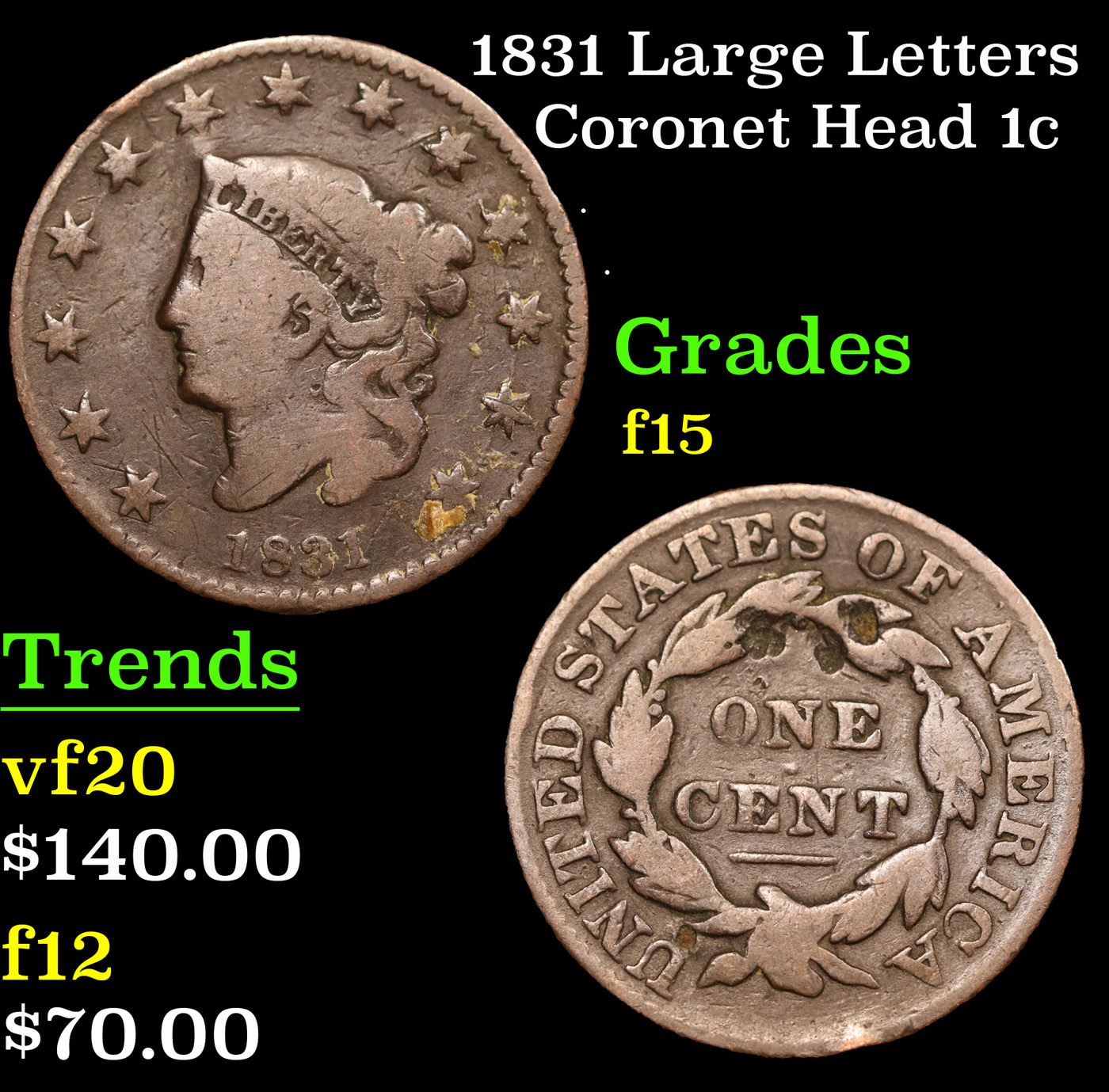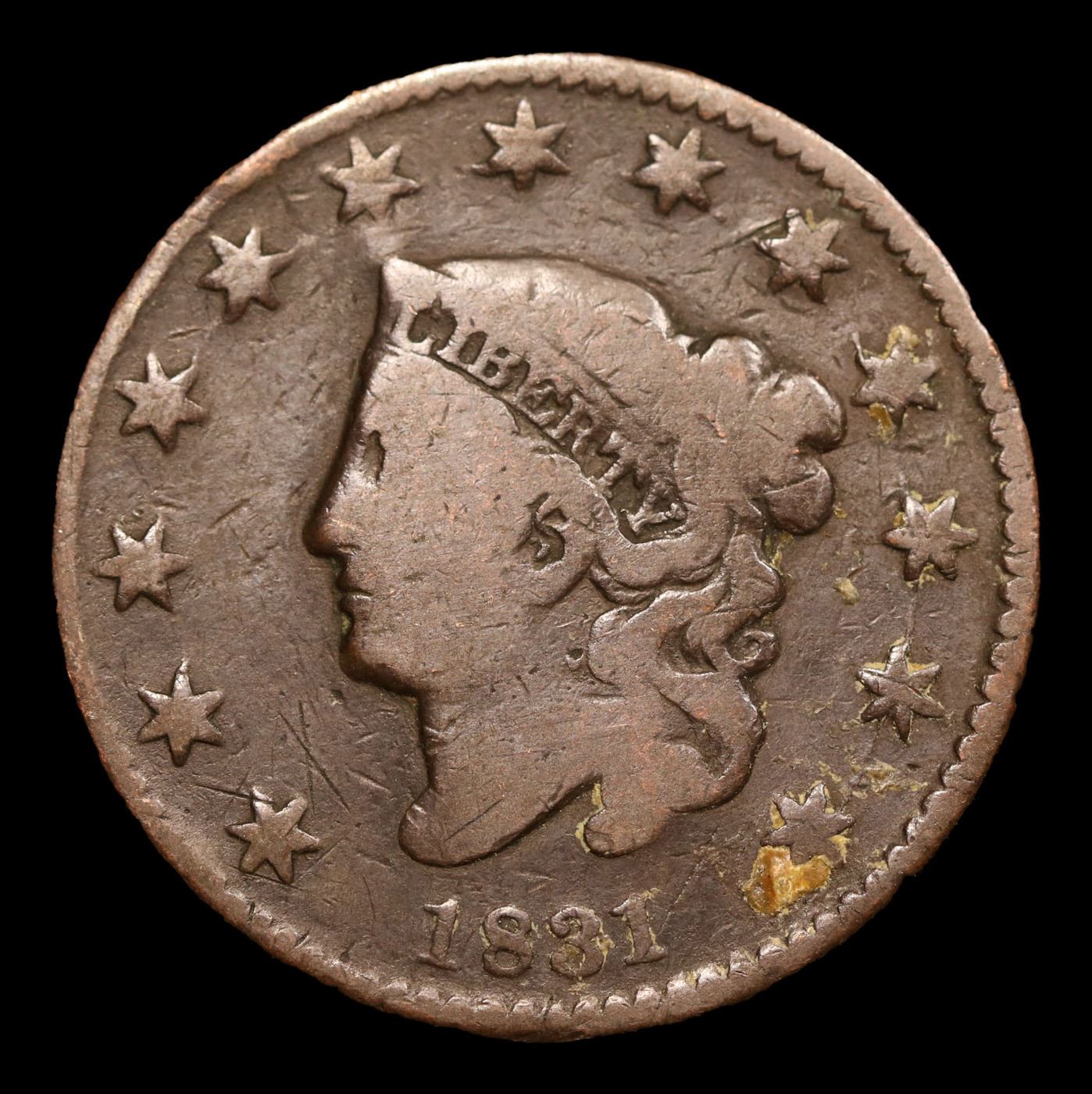 1831 Large Letters Coronet Head Large Cent 1c Grades f+.