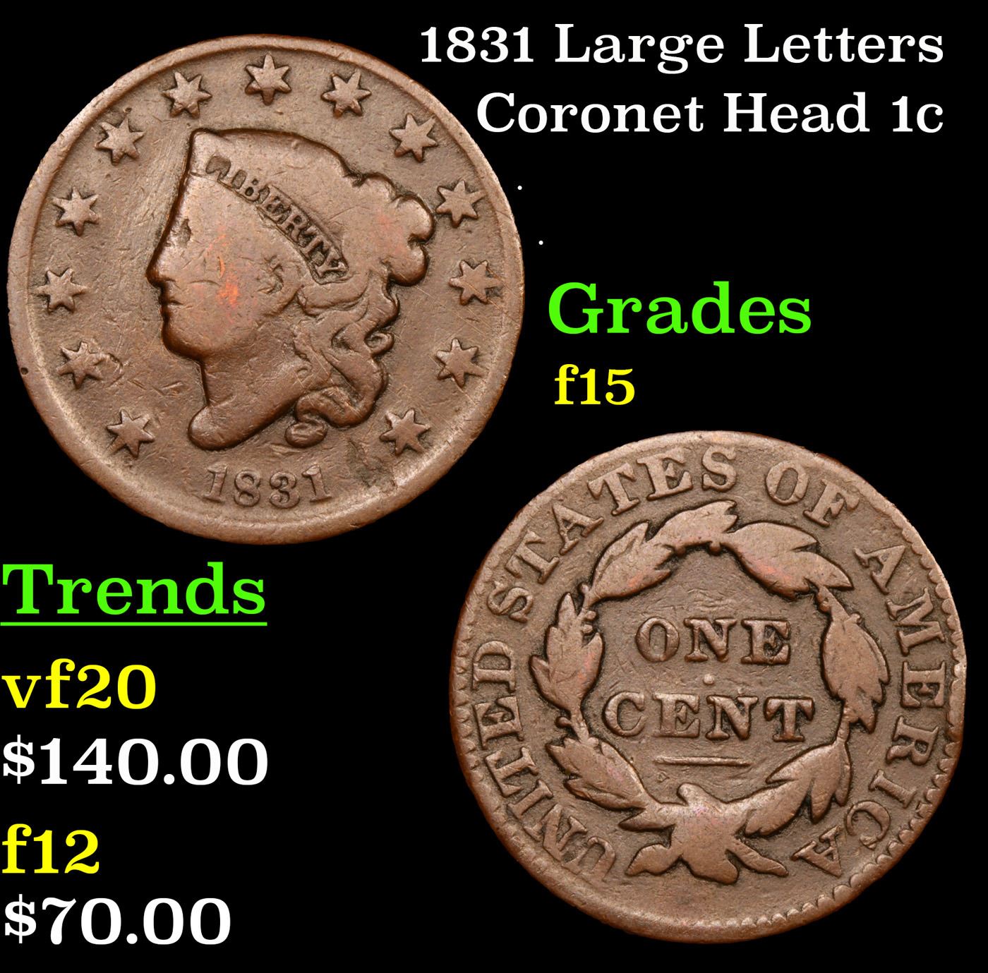 1831 Large Letters Coronet Head Large Cent 1c Grades f+.