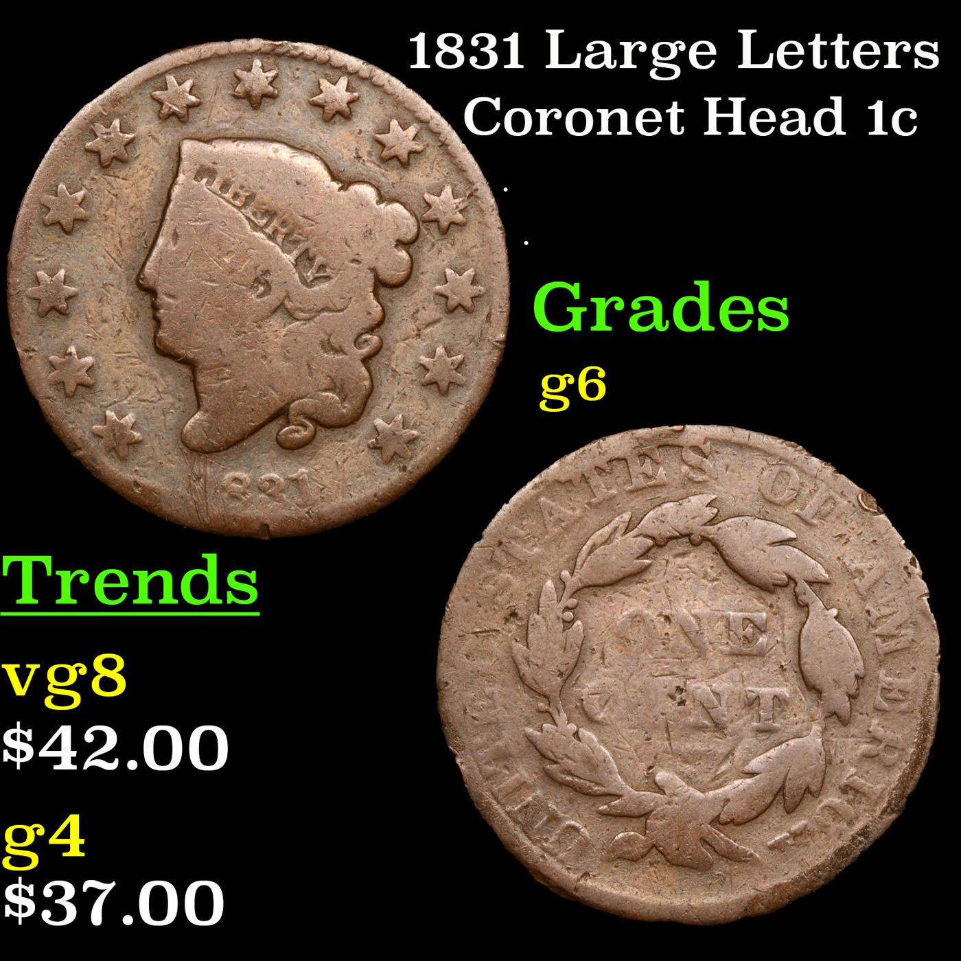 1831 Large Letters Coronet Head Large Cent 1c Grades g+.