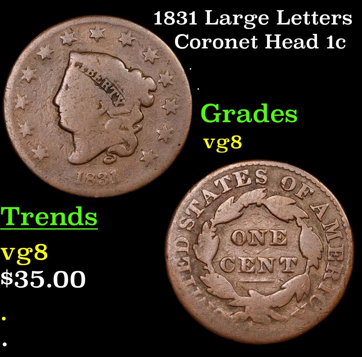 1831 Large Letters Coronet Head Large Cent 1c Grades vg, very good
