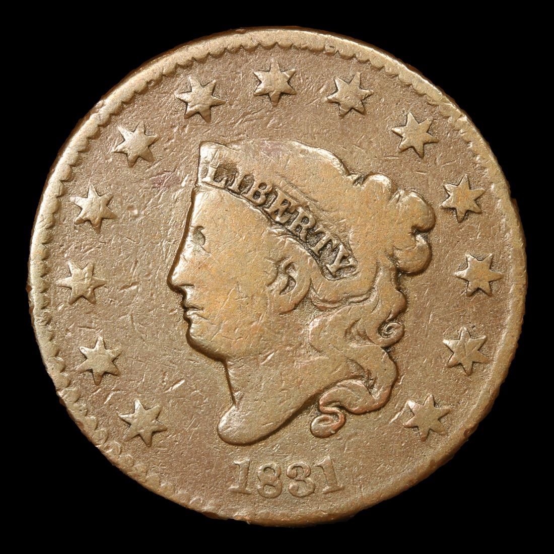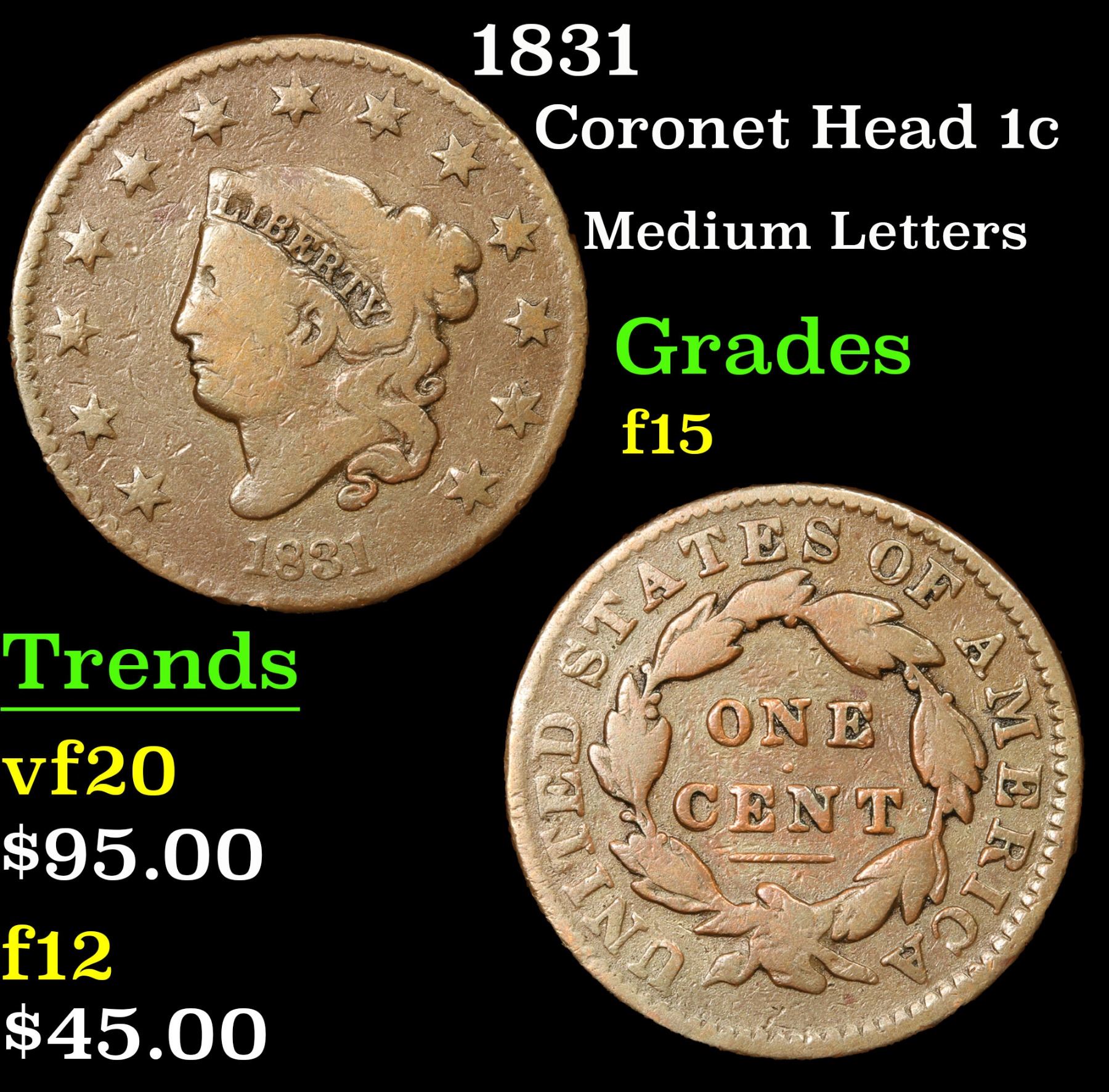 1831 Medium Letters . Coronet Head Large Cent 1c Grades f+.