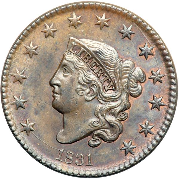 1831 N-1 R1 MS60. PCGS graded MS-64 Brown. Lustrous bluish steel brown and chocolate with traces of faded mint red showing on both sides. No spots or stains, just a few tiny ticks on the jawline. MDS. The obverse is cracked, as always, from the dentils over star 8 through stars 9-13, top of the date, and stars 1-4. Both sides show radial die flowlines, and some of the stars are flowing into the rim. Removed from an NGC slab graded MS64BN (NGC label included, and it shows the attribution and Reiver provenance). Our grade is MS60. Pop 1. The only graded at PCGS for the variety. DWH #3462.