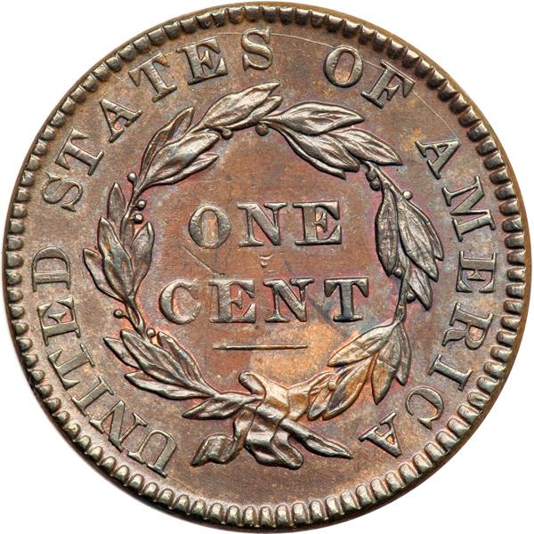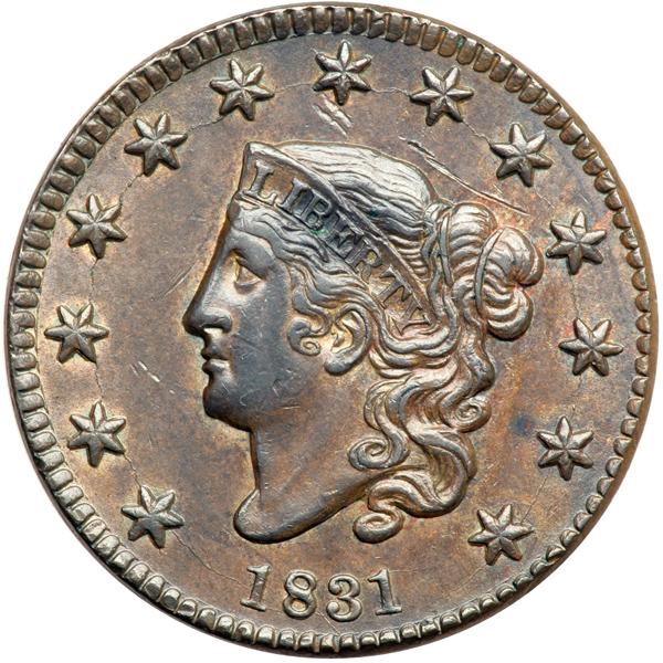 1831 N-11 R2 EF40+. Small Letters Reverse. EF-40+. Sharpness AU50 with a dull scratch in the field close above the head, two thin nicks under star 7, and a splash of dark olive toning at BE in LIBERTY. Otherwise a nice glossy steel brown and chocolate with frosty golden tan in protected areas and traces of very faded mint red on the reverse. EDS+, the obverse die cracks light and the fine die line from the dentils to the right bottom of the 8 clear. A new die crack extends up from the earlier crack (from the earlier N-6 marriage of this reverse die) left of the T in STATES to the dentils above. The reverse is rotated 10 degrees CCW. DWH #0775.