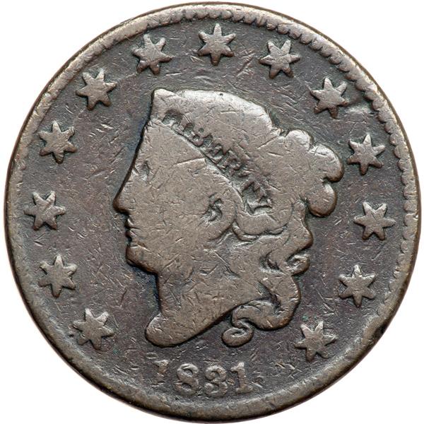 1831 N-11 R2 G5+. Small Letters Reverse. Good-5+. Very slightly sharper with too many light nicks for the higher grade. A dull rim nick under star 12 and a shallow low spot right of star 9 are the notable marks. Rather glossy chocolate with steel brown highpoints. M-LDS with a cud break joining the tops of TES to the rim above. The top of that S is not filled. DWH #0776.