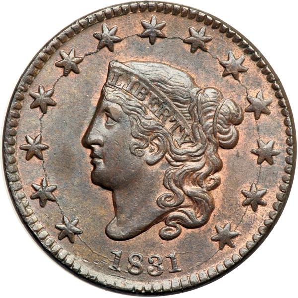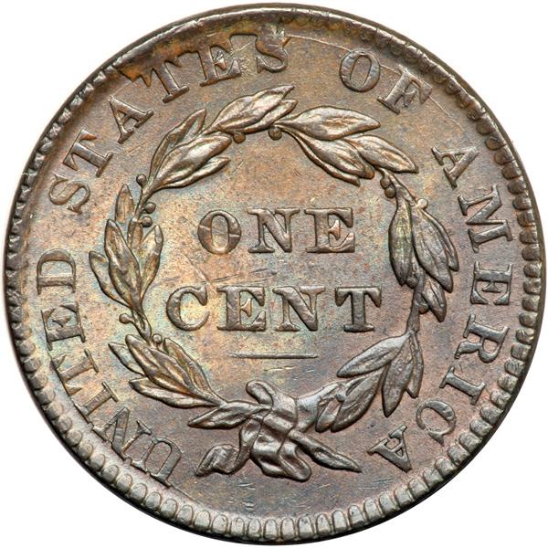 1831 N-11 R2 MS60. Small Letters Reverse. PCGS graded MS-63 Brown. Lustrous steel brown and chocolate with 5% of the mint red remaining, mostly on the obverse, and delicate hints of bluish steel overtone on both sides. There is a tiny pinprick in the field under the hairbun, several very tiny ticks around the base of the first 1 in the date, and a couple thin, very light nicks at the top of the E in CENT. Latest die state with a strong cud break connecting TES to the rim above and the top of that S filled as part of the cud. Called MS60 and tied for CC#5 in the Noyes census, his photo #25647. Called MS60+ and tied for CC#3 of the business strikes in the Bland census. Removed from an NGC slab graded MS64BN (NGC label included). Our grade is MS60. Pop 2; 1 in 64. Only 3 graded at PCGS for the variety. DWH #2614.