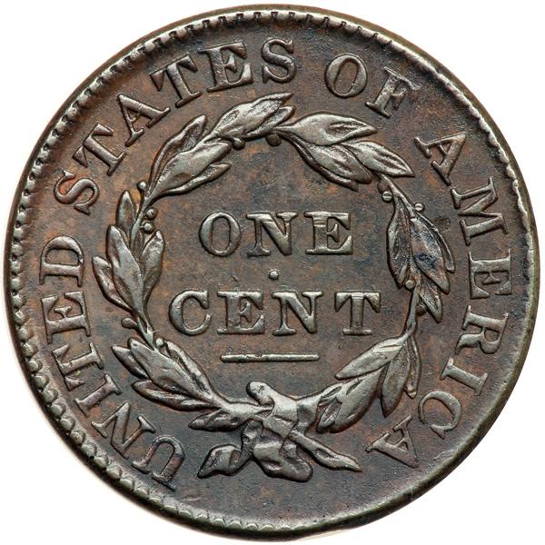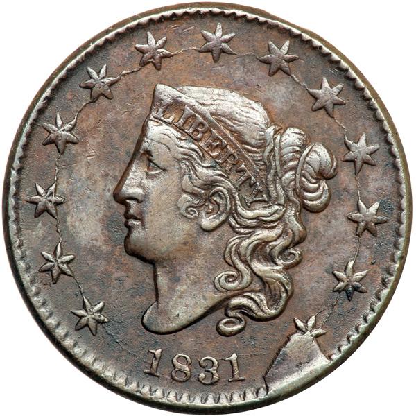 1831 N-12/2 R6 (as a die state) VF30. 3-point cud at star 13. Clipped Planchet. VF-30. Five points sharper with traces of very fine verdigris dusted into some of the protected areas. The only mark of any consequence is a small, shallow pitmark under the M in AMERICA. Slightly glossy chocolate brown mottled with some lighter steel brown tones. Traces of frosty luster show on both sides. Rare LDS with a 3-point cud break at star 13. In addition, there is a tiny planchet clip that barely affects the dentils at star 8. A sharp, attractive example of this rare die state. Called VF35 net VF25 and tied for CC#3 of the rare 3-point cud die state in the Noyes census, his photo #36768. DWH #3218.